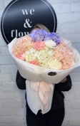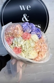 Яскравий букет з поєднанням гортензій різних відтінків і ніжних діантусів створює святковий настрій. Ідеальний подарунок для дня народження, ювілею чи просто, щоб висловити теплі почуття.