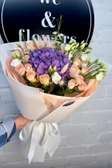 Елегантний букет у фіолетово-рожевих відтінках зачаровує своєю ніжністю та глибиною. Гортензія, лагурус і кущова троянда створюють гармонійне поєднання, що дарує атмосферу спокою та чарівності.