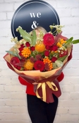 Яскравий осінній букет з трояндами, леукаспермумом та капсікумом — тепла гармонія кольорів, що створює настрій осені.