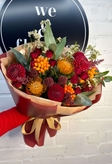 Букет осінній з трояндами, леукаспермумом та капсікумом