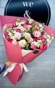 Ніжний букет у рожевих відтінках, який випромінює тепло, жіночність і гармонію. Поєднання піоновидних троянд, матіоли та еустоми створює ароматну й вишукану композицію для найтепліших моментів.