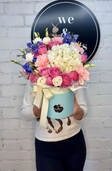 Елегантна композиція в коробці з трояндами, дельфініумом та гортензією — стильний подарунок для святкових і романтичних моментів.