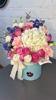 Композиція в коробці з трояндами, дельфініумом та гортензією