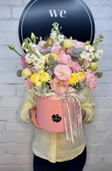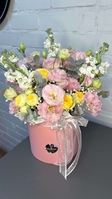 Ніжна композиція з рожевою еустомою, трояндами та матіолою — витончене поєднання ароматних квітів для особливих моментів.